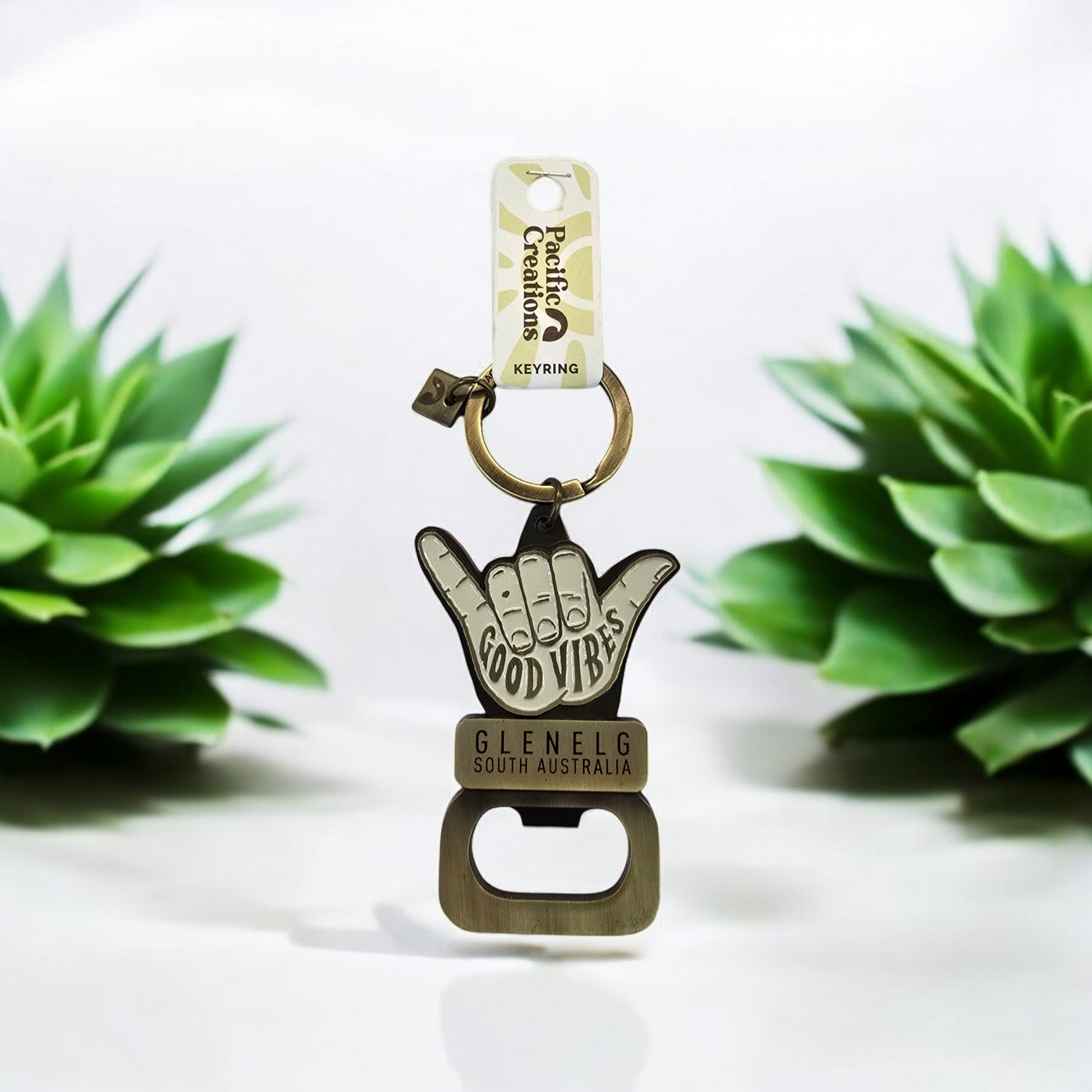 This fun and vibrant keyring features the classic "shaka" hand sign, a symbol of positivity and good vibes. Perfect for surfers, beach lovers, and anyone looking for a cheerful souvenir, this keyring is a must-have from Glenelg, South Australia. Its practical bottle opener function adds to its appeal, making it a functional and stylish accessory. The "Glenelg" and "South Australia" inscriptions ensure you'll always remember your time in this beautiful coastal town.