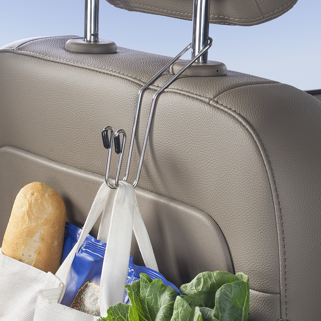 A set of 2 car hooks that convert a car headrest post into convenient storage space. High Road CarHooks headrest hangers hold up to 10 kgs . each to store grocery bags, handbags, hats, jackets. leashes and more, off the floor and out of seating for clean and safe travels. Use on the front seat as a handbag hook or in the back for general storage