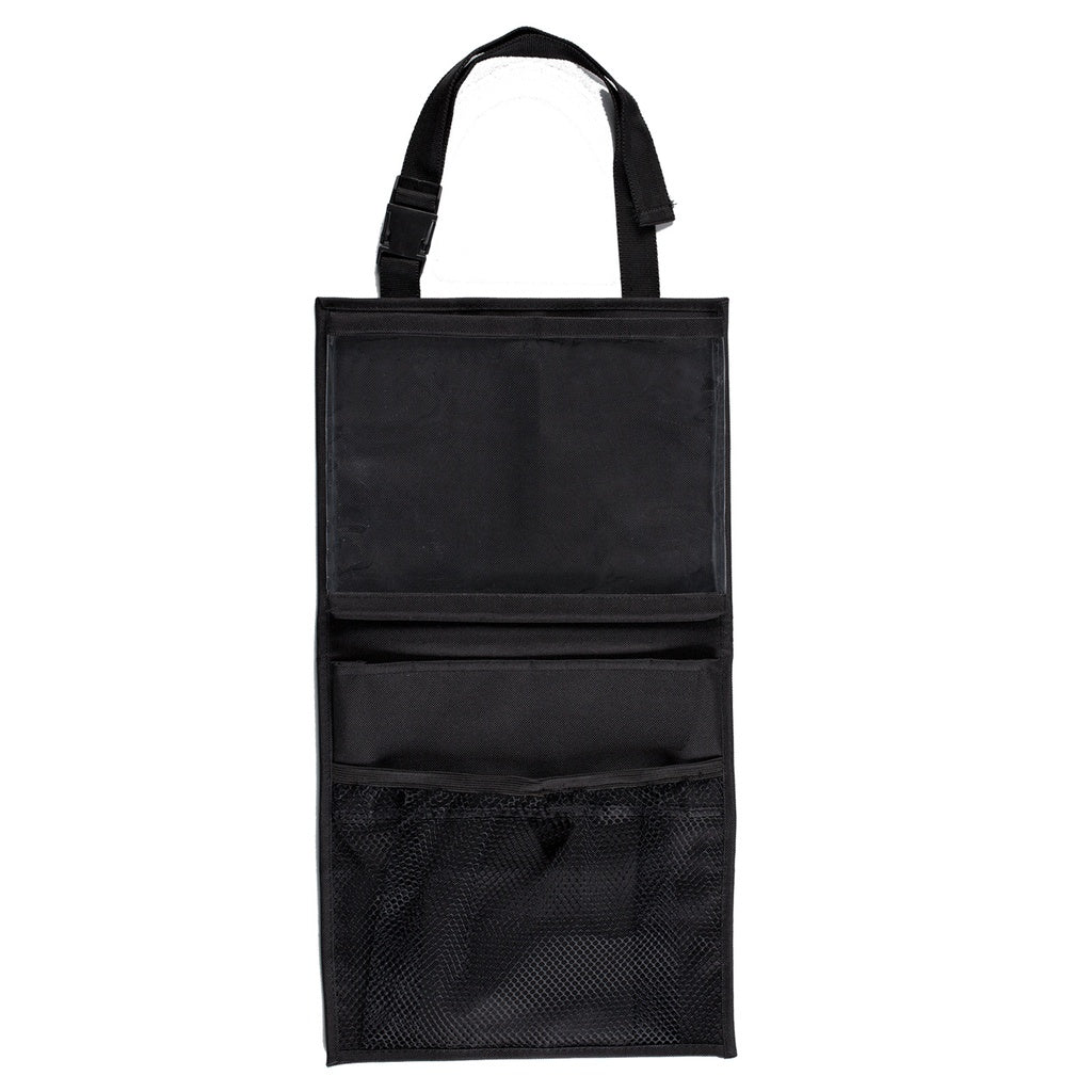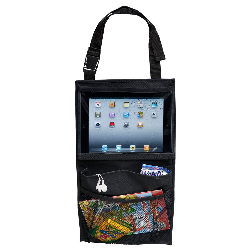 Keep backseat riders busy and entertained. Protective tablet pocket allows touch screen access and wipes clean for clear viewing. Middle pocket stores cords and snacks. Easy-view, mesh bottom pocket holds books, handheld games, magazines, crayons and more. Heavy-duty webbing on the adjustable buckled strap insures safe iPad passage.