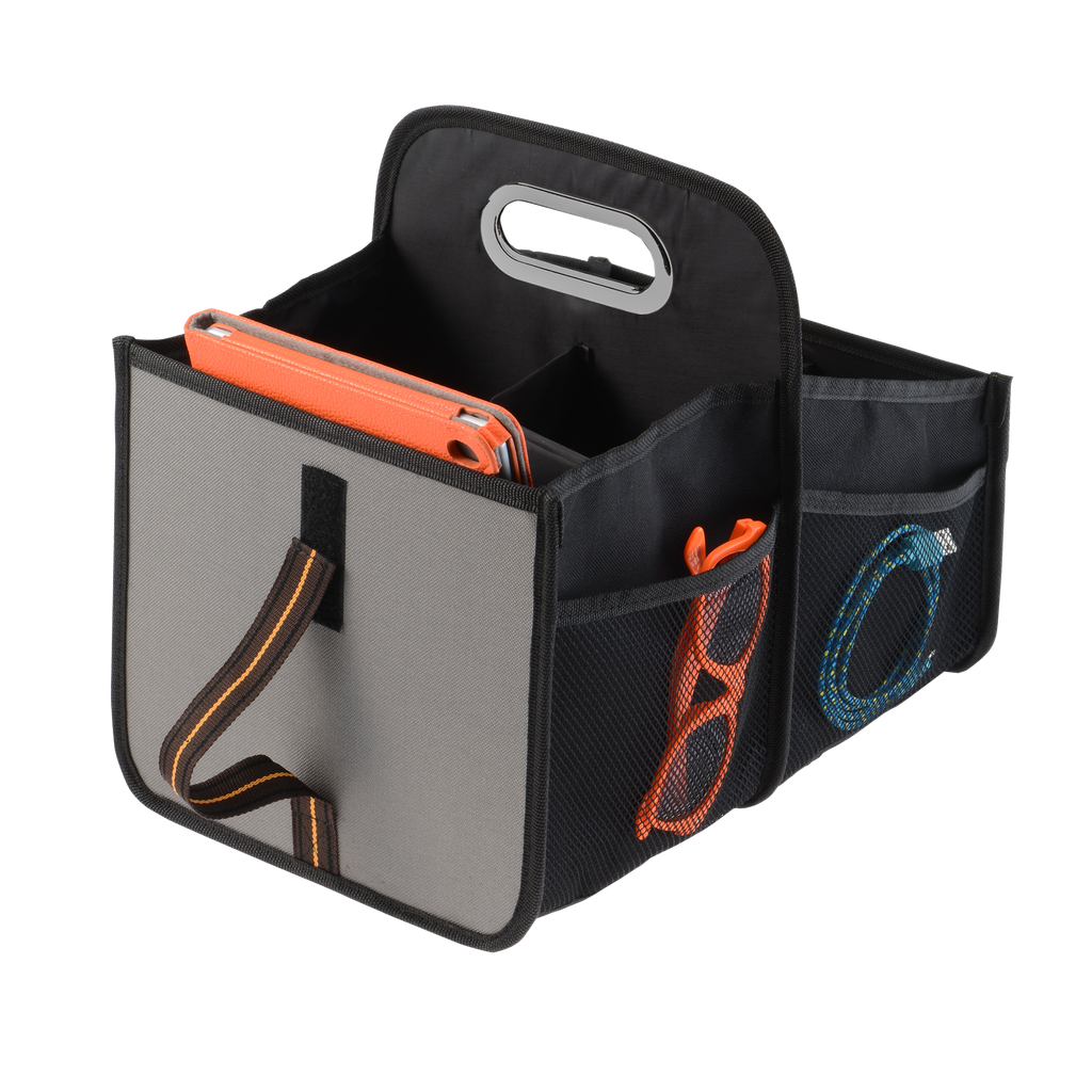 Handled seat organizer has movable dividers to keep driver and kid needs organized and secure. Each of two large inside compartments can be sued as a single bin or divided into four mini bins. Five outside mesh pockets store easy-access items, and a seatbelt strap on back keeps the organizer from sliding. Center handle with durable metal rim. PATENTED.