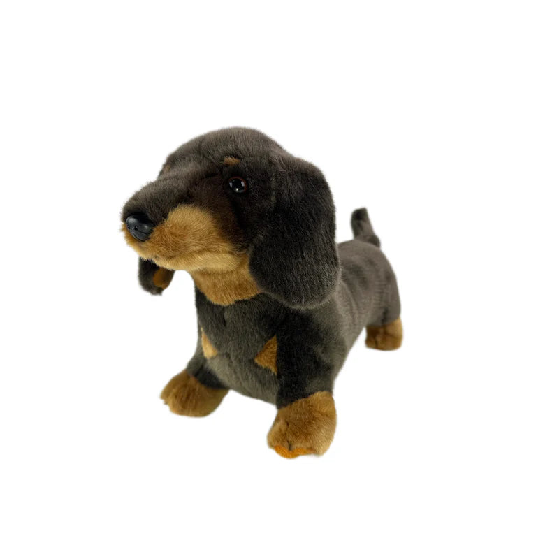 Stretch is a realistic plush chocolate and tan Dachshund dog toy in a standing position.