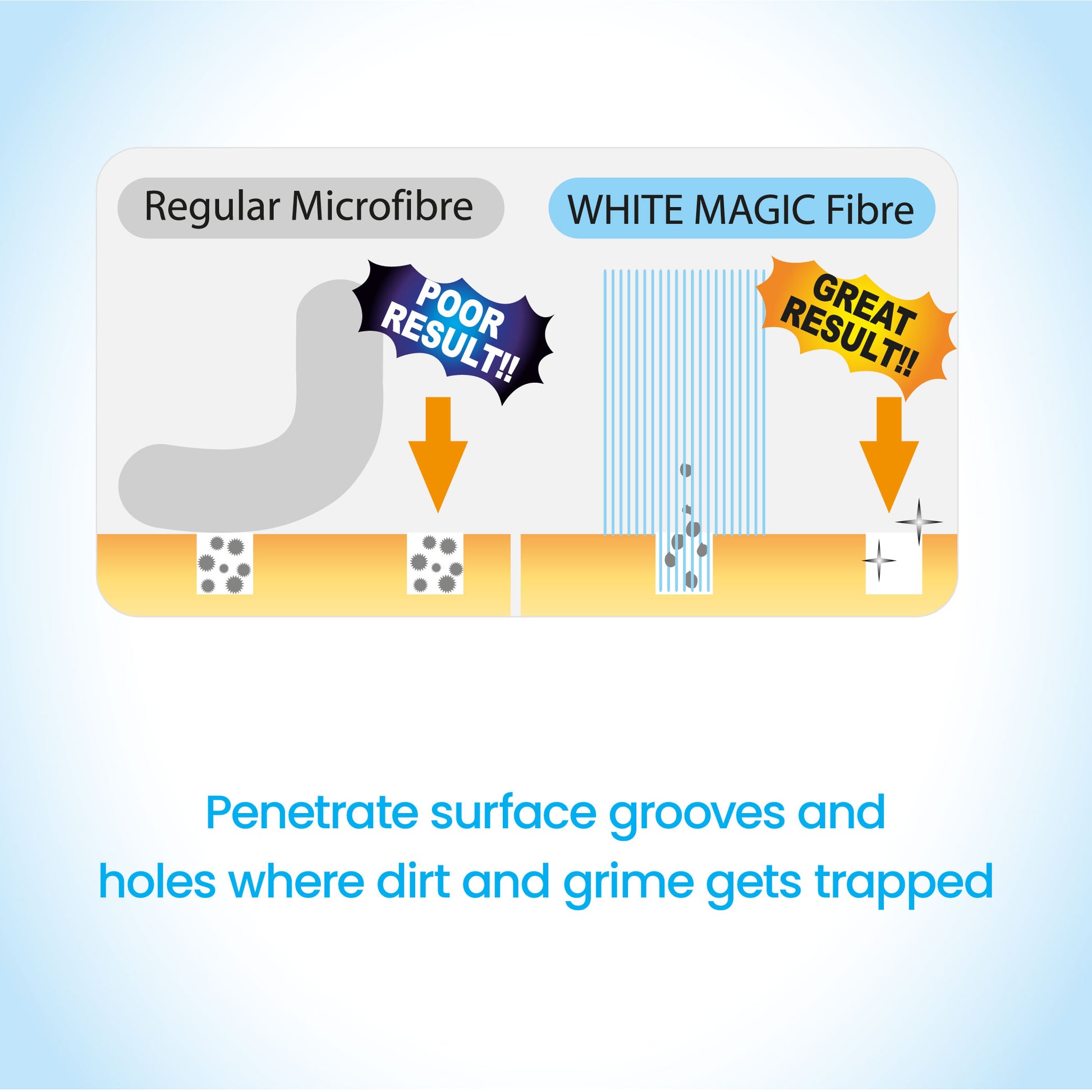 The White Magic Extra Power Sponge is the result of compressing a 3cm thick white sponge to just 1.5cm, making it twice as hard as other microfiber sponges on the market. This enhanced density not only increases its durability but also ensures it lasts twice as long. Its ergonomic design includes a contoured scrubbing surface for heavy-duty cleaning, making it both easy to handle and highly effective.
